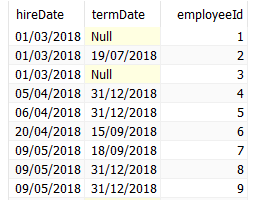 Curtis provided a link to two tables. The first was an Employees table with Hire Date and Term Date (a few rows of the table below):