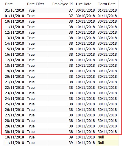 Partial results of the join with the filter in place can be seen below with the rows for employee 38 highlighted. There is now one row for every day of that person’s employment, i.e. between their Hire Date of 10th Nov 2018 and their Term Date of 30th Nov 2018.