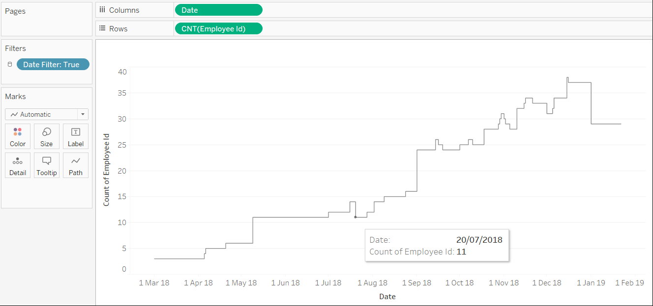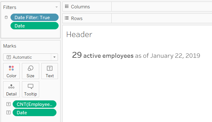 The header, showing the number of employees on the most recent day in the data was created on a separate sheet, shown below. I filtered the data to the last day in the data.
