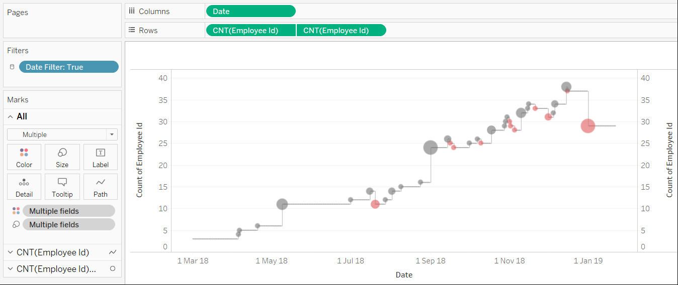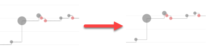 I wasn’t keen on the dots being prominent along the lines where there was a zero daily change, so I amended the Daily Total calc to check for zeros and return NULL in those cases so no circle would be drawn: