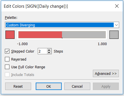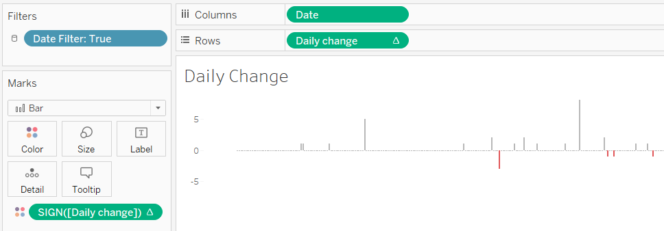 For sizing the circles I wrapped the Daily Change calc in an ABS() function to make the negative changes positive, such that a change of +5 or -5 would appear the same size.