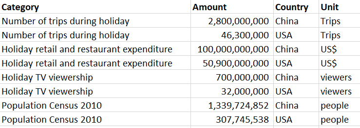 This week’s #MakeoverMonday provided a small data set that summarised some of the events around these two large events – Chinese New Year and Thanksgiving – that take place in China and the USA respectively.