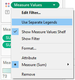 To get the separate legends for Measure Values, this can be selected from the drop down menu of the Measure Values pill that is on the Colour shelf: