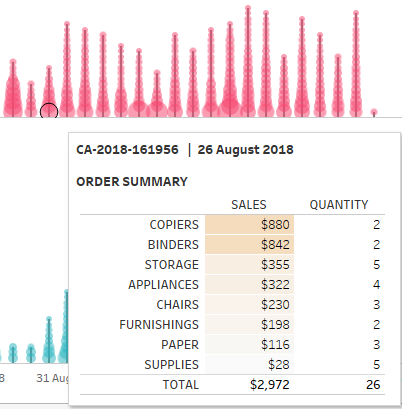 For this challenge, when hovering over one of the orders, a table should show with a breakdown of the Sub-Categories that make up that order along with the Sales and Quantity of each Sub-Category. For example: