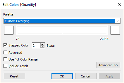 For the Sales measure I used a Custom Sequential orange palette (white to orange). As there shouldn’t be any colour showing on the Quantity column, I used a Custom Diverging palette, but selected both ends of the palette to be white, as below: