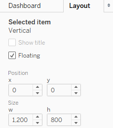 Back in Tableau, add a floating container (horizontal or vertical) to your dashboard, then drop in your help overlay image. Now resize your container and position it so it overlays your dashboard exactly. It is easier to do this step using the position x and y inputs on the layout tab on the dashboard: