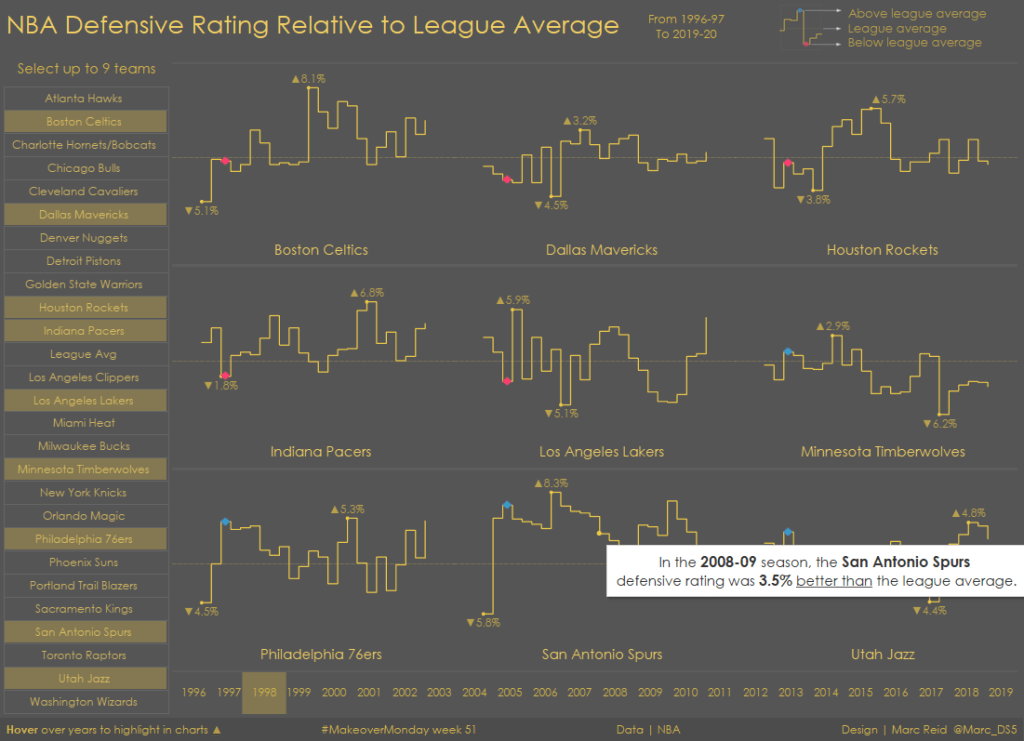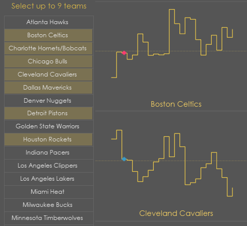 For this #MakeoverMonday dashboard, I want to show a list of NBA teams and be able to select up to nine teams with the following requirements: