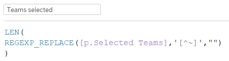 The Teams Selected calculation is below. This counts the number of team names currently in the parameter by replacing all characters except the tilde (~) delimiter with an empty string, which results in a string of tildes – one for each team name. The length of this string is then calculated: