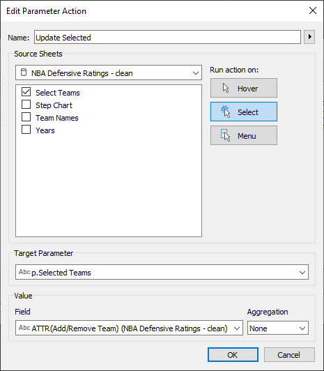 Another advantage of parameter actions over set actions is that parameters do not depend on a single data source. With the new action feature concatinate, it is easy to build multiselect global parameters.