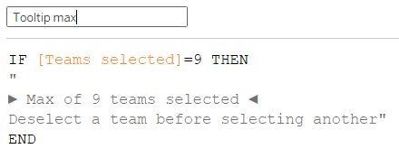 The final requirement is to show a message in the tooltip if there are already nine teams selected (as I’ve designed the small multiple for my dashboard as a 3×3 grid). This is achieved by adding the following calculation to the tooltip shelf: