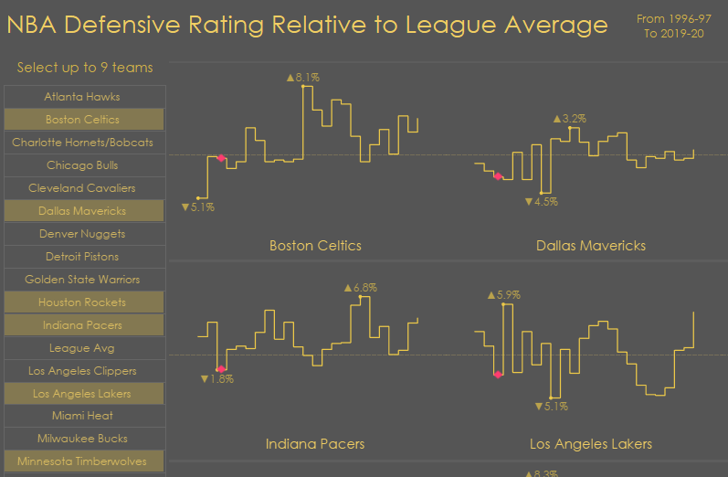 For this #MakeoverMonday dashboard, I want to show a list of NBA teams and be able to select up to nine teams with the following requirements: