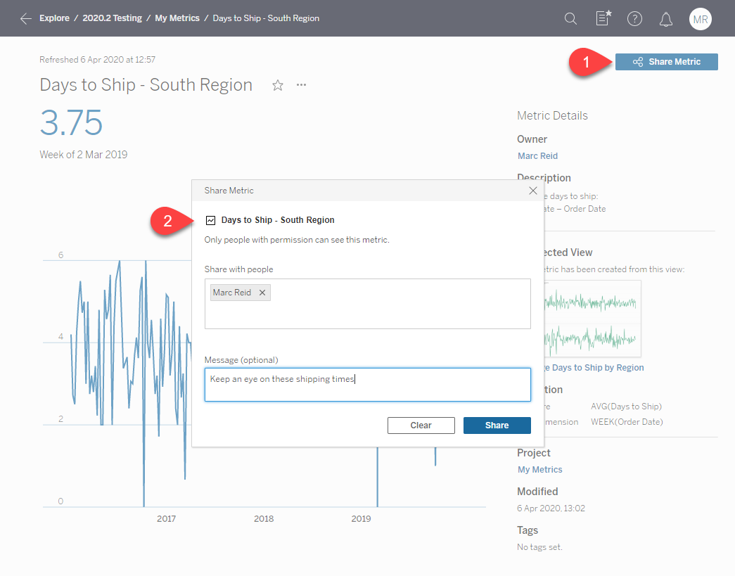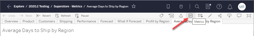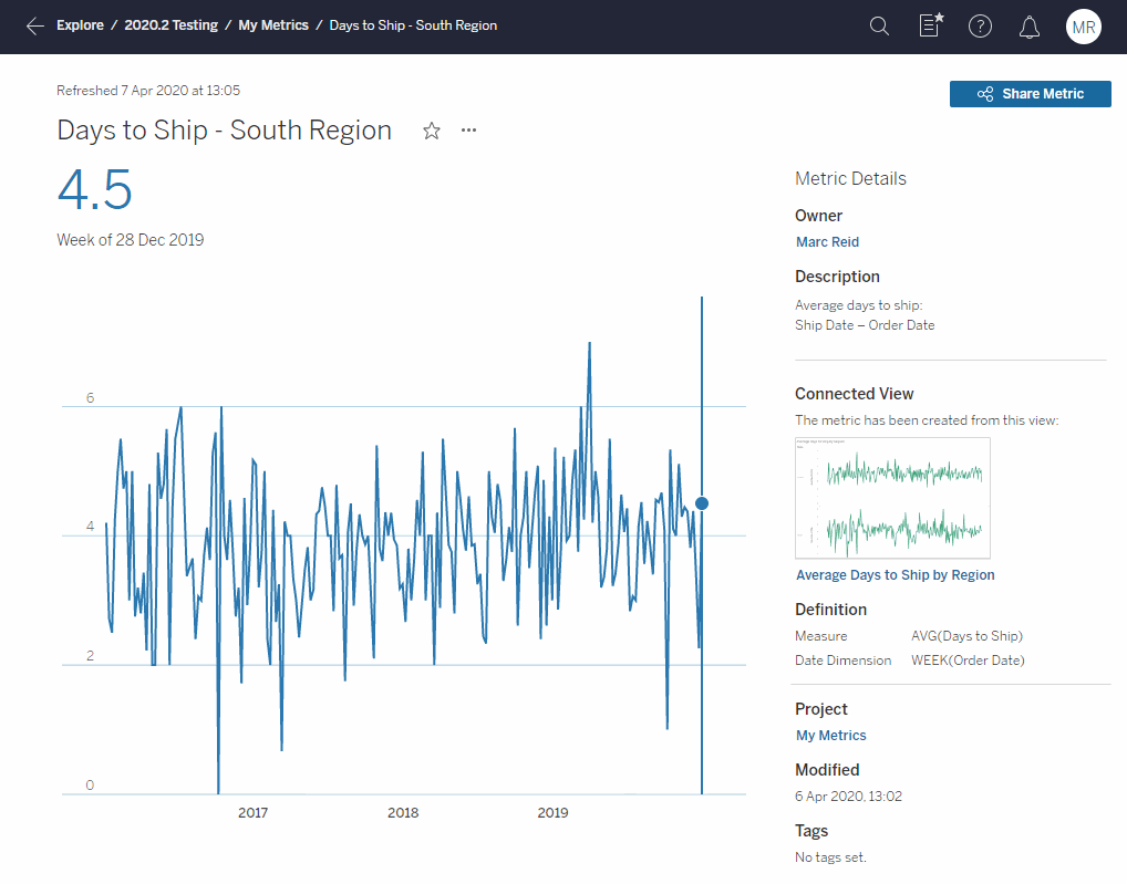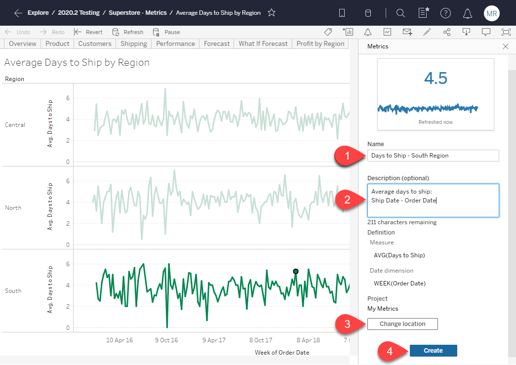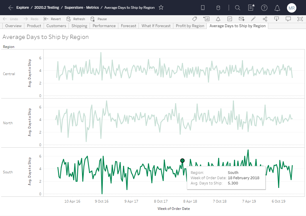 Here I’ve selected a mark on the average days to ship in the South region trend line. It’s important to note that Metrics are based on the level of detail of the mark that you select. So, for example, based on the view below, I couldn’t create a Metric to track the average days to ship a product across all regions as that is not what this view shows. It is broken down by Region, so I need to pick on of those regions for the metric to be based on.
