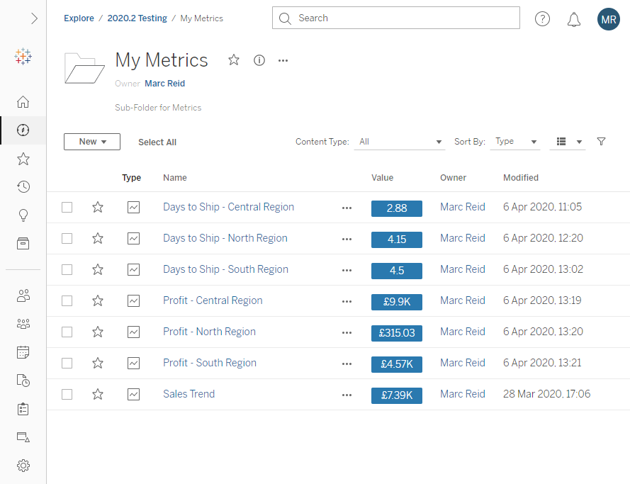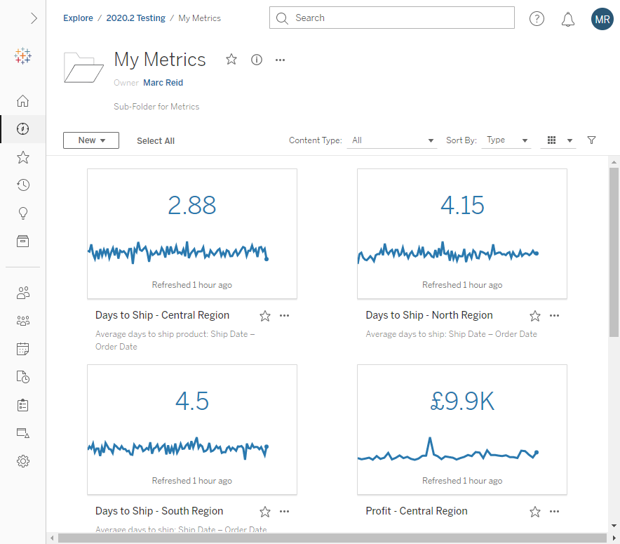 In the above example, Metrics have been created from four different Views (contained within three separate dashboards). These metrics can then all be seen together in a grid view within one folder on Tableau Server.