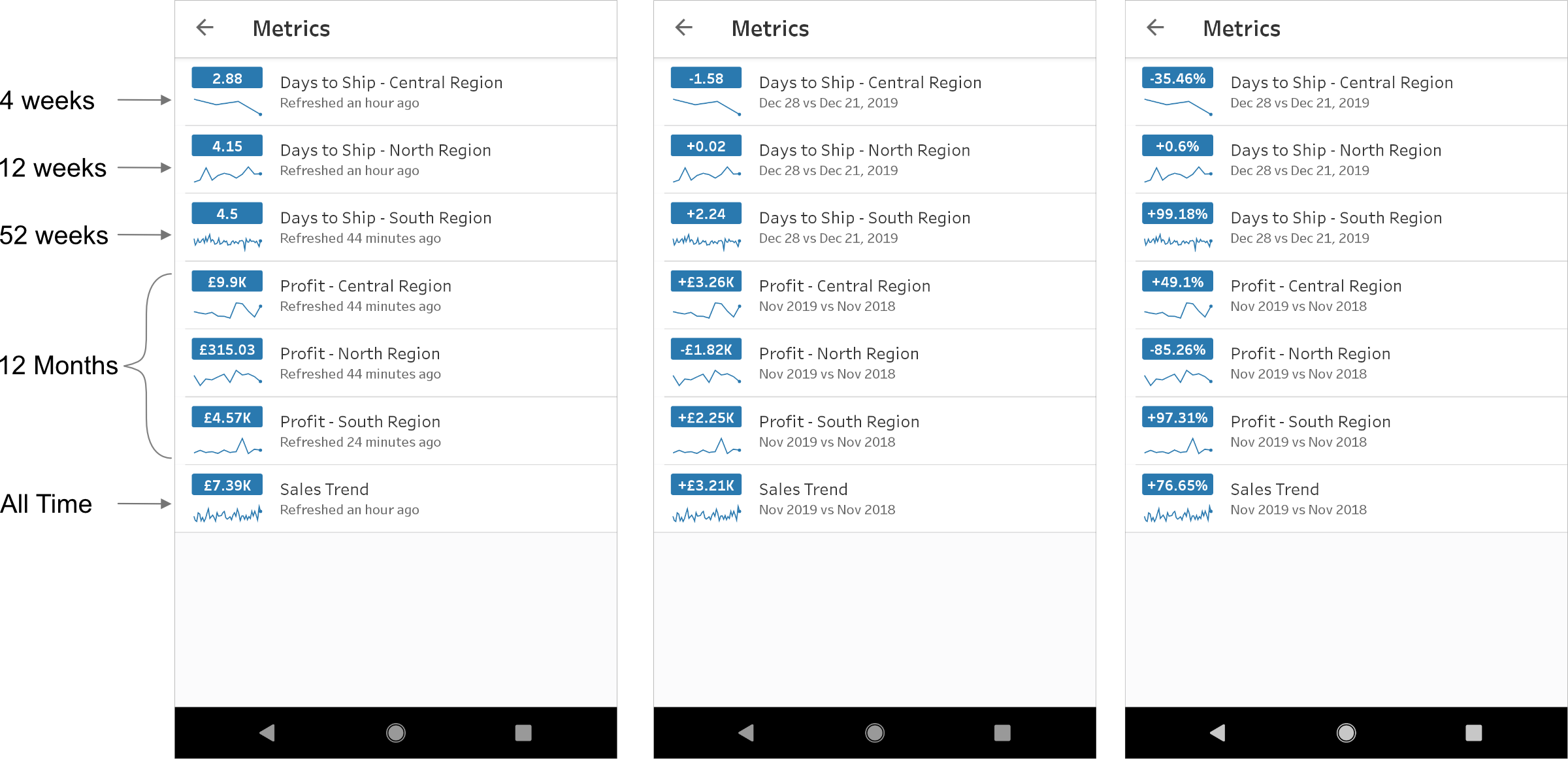 The below 3 screens show the same set of Metrics on mobile, each with a different view