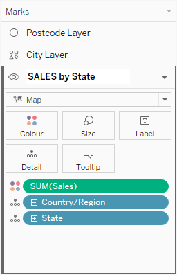 The first layer is created in the same way as before Map Layers. Simply double click on the State field for it to appear in the view and a map is automatically created. Change the mark type to Map and add the Sales measure to colour: