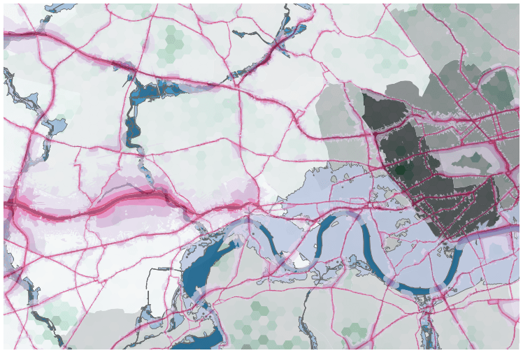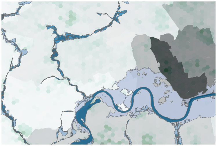 Below are the same six map layers being layered one on top of the other in Tableau, showing a zoomed-in section of the city for clarity: