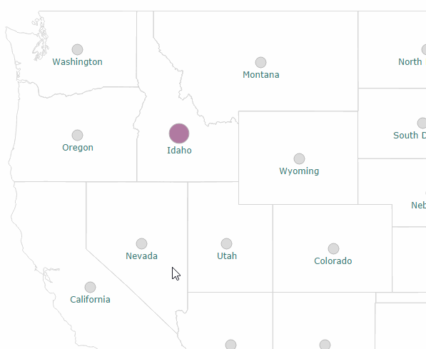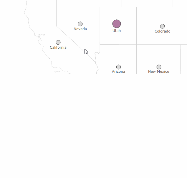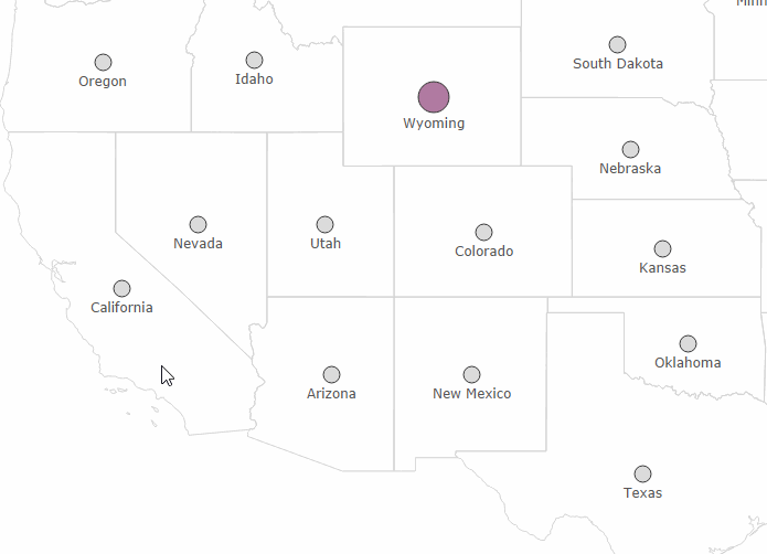 Again, the buffer positions are based off of the latitude and longitude of the selected state using different parameters for positioning and spacing. A circle mark could also be used, however, the nice thing about buffers is that they scale with the map as you zoom so we don’t get the overlapping issue as we saw with the pie charts earlier (although the text labels don’t scale).
