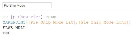 The pie charts are created using a MAKEPOINT calculation with the latitude and longitude being calculated as offset from the latitude and longitude of the selected state. To toggle their visibility a boolean parameter is used – if TRUE, the point is created, if not, then NULL is returned and no point in created so no pie charts are shown.