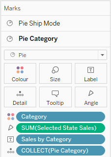 Once the point in created, the mark type of pie is selected and sales (or whichever metric) for the selected state is added to the marks card along with a dimension to create the pie segments – the below example is for the sales by category pie chart: