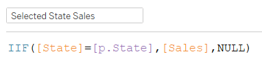 It’s important to note that you can’t just use the sales measure as, because everything is in the same view, that would return sales for all states. Instead, when a state is selected, this updates a parameter – p.State – that is used in a calculation to return the sales for that selected state: