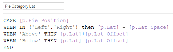 These work by updating a parameter (p.Pie Position), which in turn updates the calculations used to determine the latitude and longitude used in the respective MAKEPOINT calculations for each pie chart: