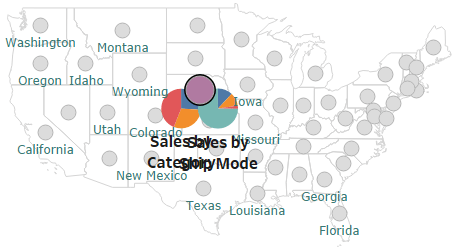 This first example looks at how pie charts can be shown or hidden next to a selected geographic point to show metrics for that geographic entity – in this case, sales by category and sales by ship mode for the selected US state: