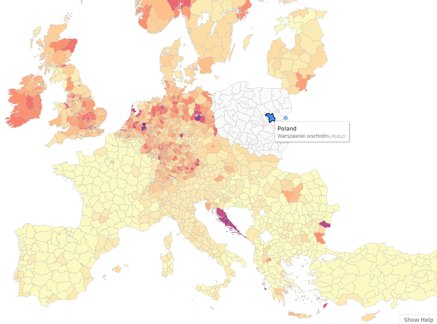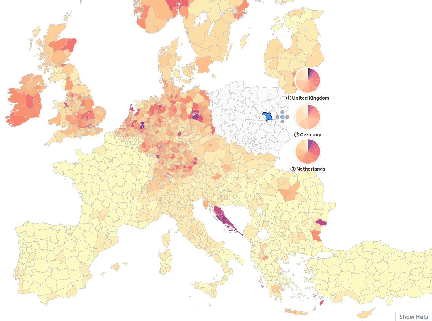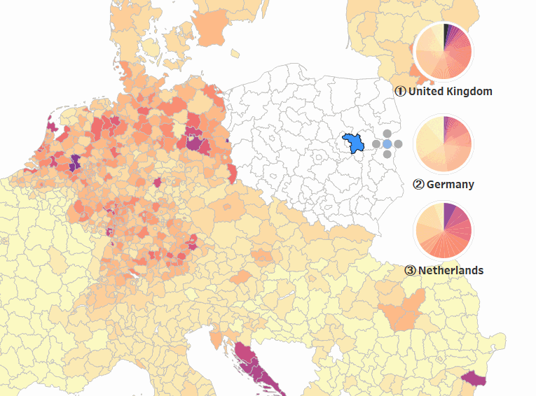 In the example below, a region of Poland is selected. Based on the map alone, we could say that it is more likely that a Facebook user in this region has a connection to someone in one of the following countries: the UK, the Netherlands, Germany, Croatia and possibly Bulgaria.