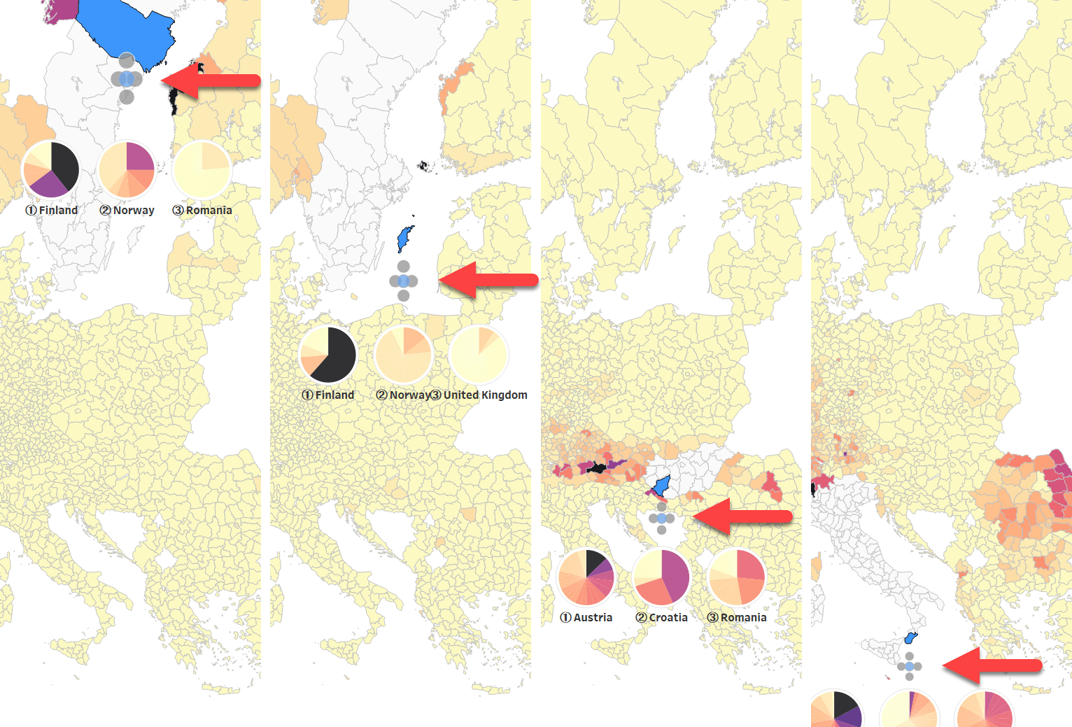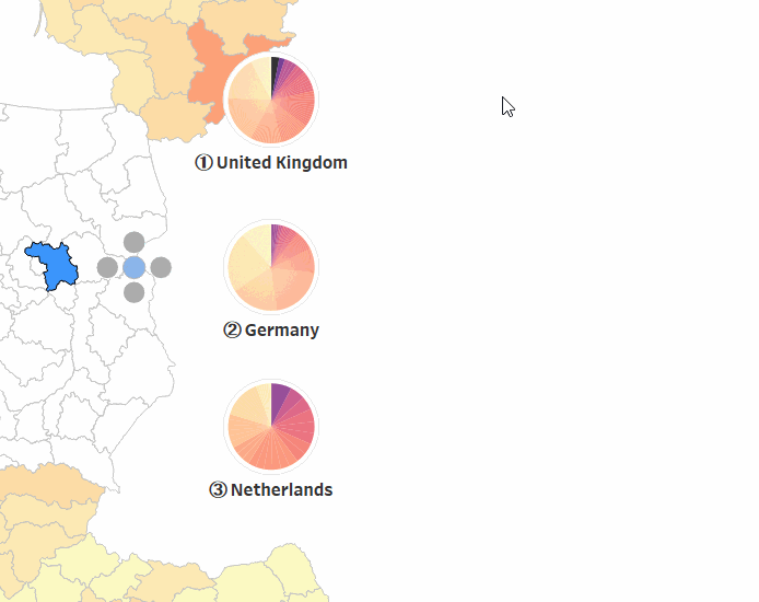 This is where having the option to show pie charts for the selected region is helpful. Clicking the blue circle (another buffer), we can show the top 3 countries, ranked 1 to 3, with each region within them as segments of the pie chart sorted from high to low based on their SCI scores: