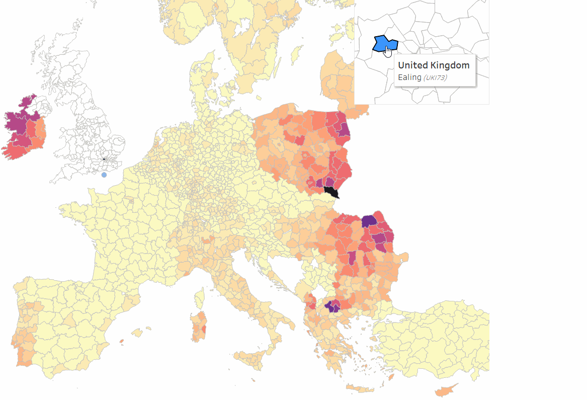 The NUTS 3 regions of London are quite small so require zooming in to select a region and then zooming back out to see the connections across Europe. To avoid this, I duplicated the main map, zoomed in on London and fixed the position (by removing the map controls).