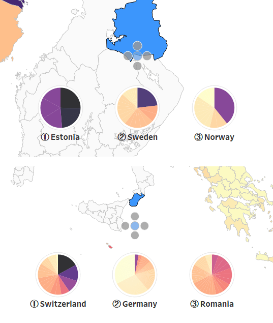 Hovering over the segments of the pie charts, we can also easily see the next highest ranking regions in each of those countries: