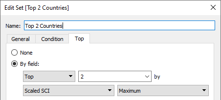 Because the pie charts are being created in the same view as the map, it’s not possible to filter to the one country required. Therefore, to add only the relevant country and its respective regions, I used sets to first isolate the top 2, top 3 and top 4 countries based on the maximum SCI scoring regions in each country. For example: