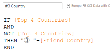 A similar calculation can also be used for creating the label next to each pie chart. For example, below is the label calculation for the pie chart showing the 3rd ranked country: