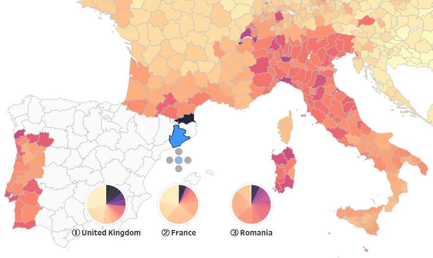 Hovering over the segments of the pie charts, we can also easily see the next highest ranking regions in each of those countries: