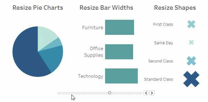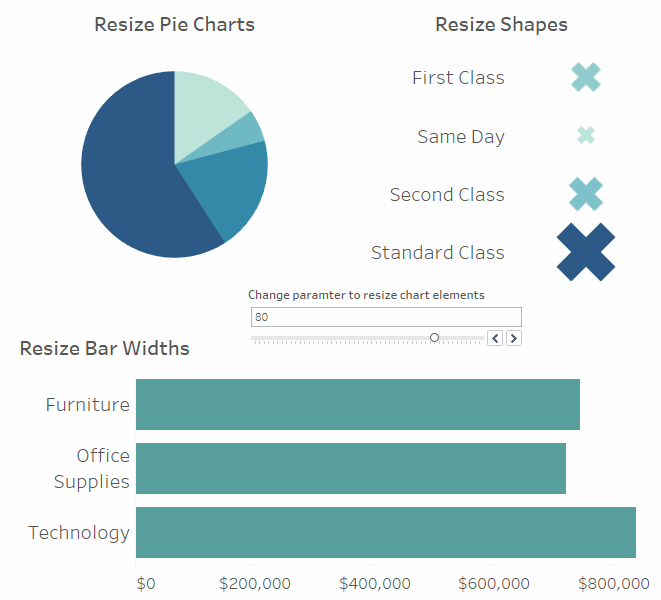 This technique also works for bar widths, shape sizes and so on. Below is a dashboard with various mark types all being resized with one parameter. You could, of course, use separate parameters if needed: