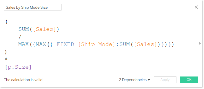 In the case of the shapes example above, the shapes are also being sized with a measure (sum of sales), so in this case a custom calculation is used in place of the parameter that normalises the sales value to a value between 0 and 1 and then multiples that by the parameter value: