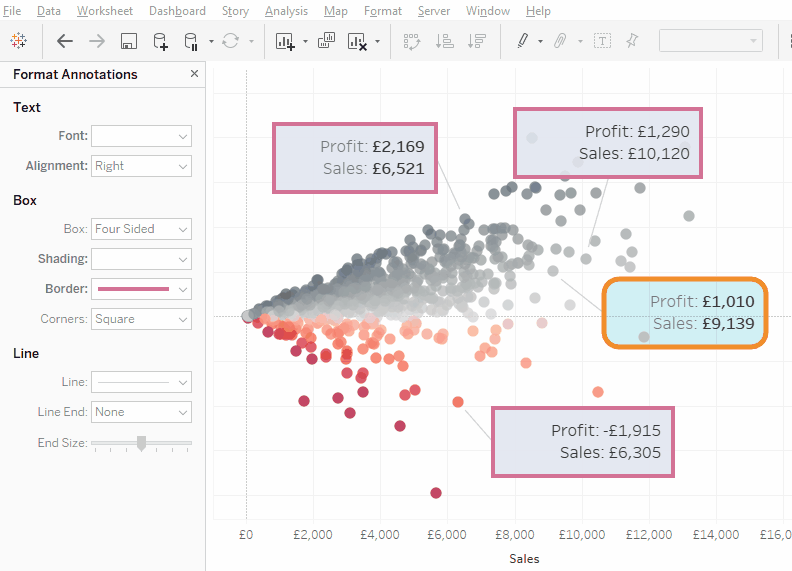 However, when you do this it overrides the workbook defaults. If you then add more annotations, you can’t format them all in one operation (at least not any aspect that you’ve formatted at the individual object level).