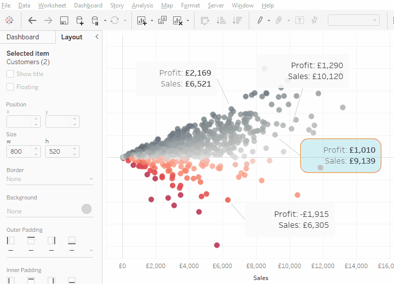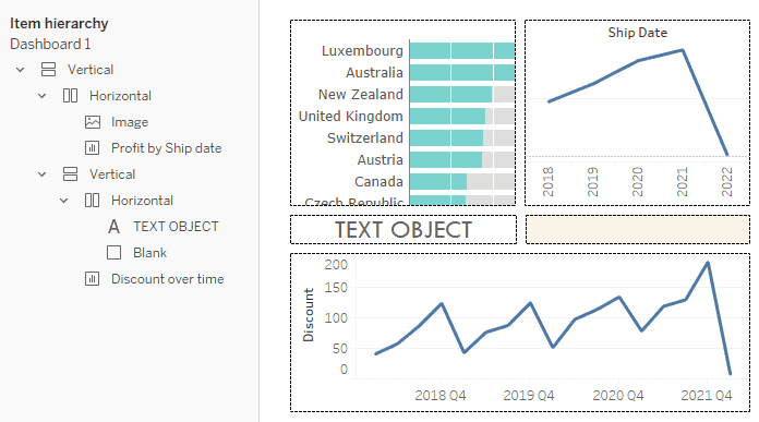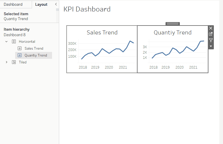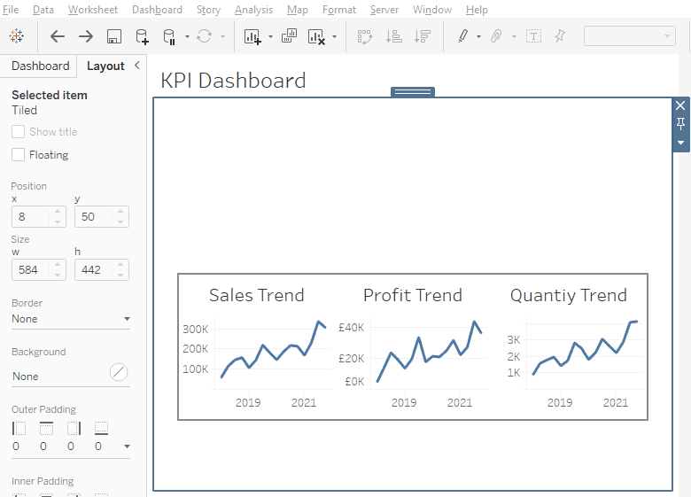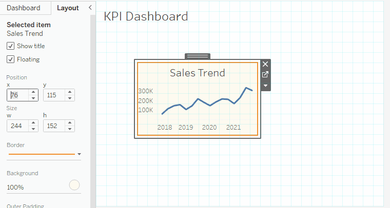 Want to quickly move a KPI sheet or text box out of a horizontal container and float it somewhere else on the dashboard? When repositioning an object on the dashboard, you can hold the SHIFT key down to toggle between floating and tiled.