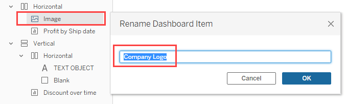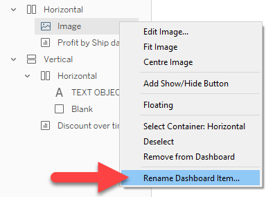 To help you navigate to the right object on your dashboard, rename objects in the Item Hierarchy. “Company Logo” is a lot easier to identify than “Image“, especially when you have lots of image objects. Views will automatically take the name of the sheet tab, so if you have given them descriptive names, you can focus on other dashboard objects, such as images, text blocks and web objects.