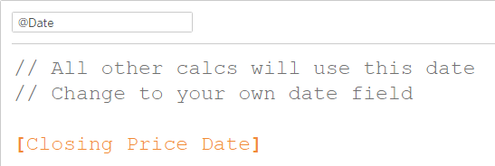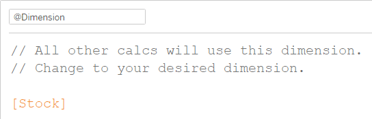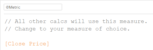 @Metric points to the [Close Price] measure and @Dimension points to the [Stock] dimension. I created these calculations to make it easier to switch to using different values as all other calculations refer to these two calculations.