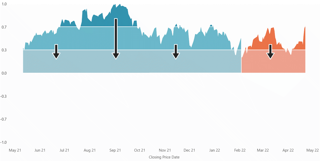 We’ll start with this section of a standard area chart showing the normalised stock price of Meta Platforms. The axis of -1 to +1 represents the stock’s normalised daily value based on its highest and lowest closing price over the full timeframe of the data (note, in the section below not all data is shown, hence the normalised value does not extend down to -1).
