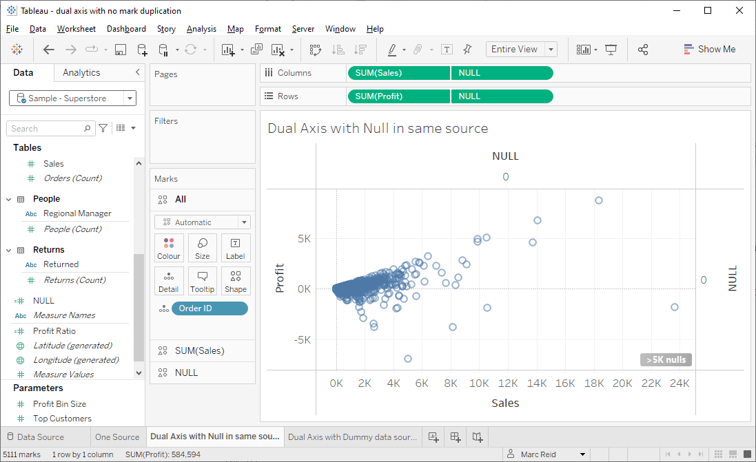 This will result in axes on all four sides of the scatter plot but the values on the NULL axes will not align. Note, doing this will also add Measure Names to the Colour shelf so remove this as it’s not needed.