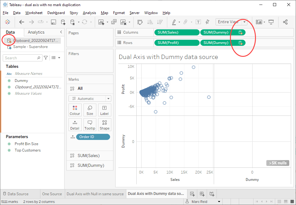 You can now follow the steps from the prior example, adding the dummy measure to the view, dual axis, synchronise etc. Here is the first step – notice how an orange tick has appeared to indicate that blending is taking place: