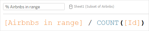 The following calculation returns a count of the number of Airbnb IDs of those that intersect with the buffer object.