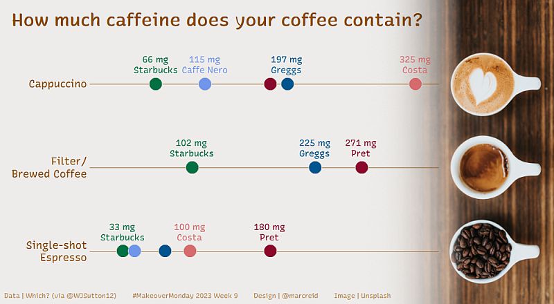 The bar chart does its job well. It’s easy to compare values across outlets for each category of coffee. In the Cappuccino category, Starbucks has the lowest level of caffeine and Costa has the highest (five times more, in fact!).