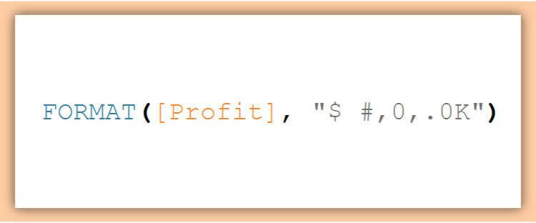 WHEN “Profit” THEN FORMAT( [Profit], “$ #,0,.0K”)