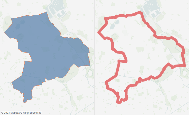 Below is an image of a polygon on the left and line string outline of the same polygon created with the Outline function.