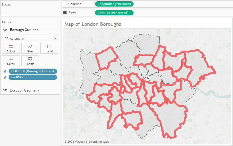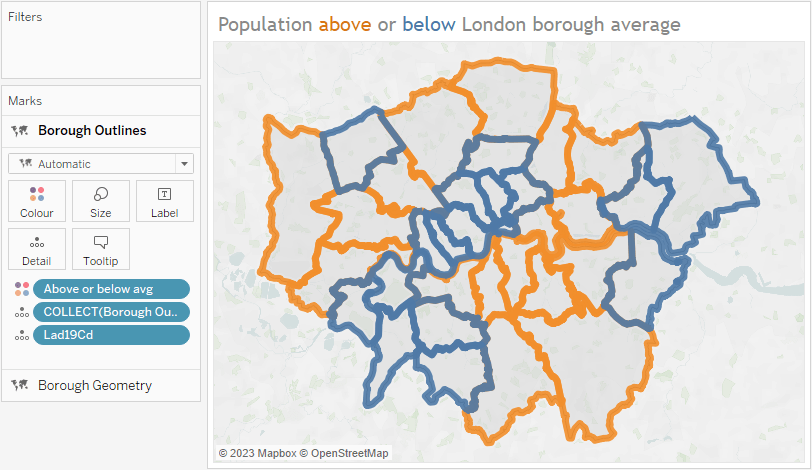 Instead of manual selection to colour the outlines, they could be colour encoded based on a categorisation. This example uses a boolean calculation to determine if the population of each borough is above or below the average population across all London boroughs.