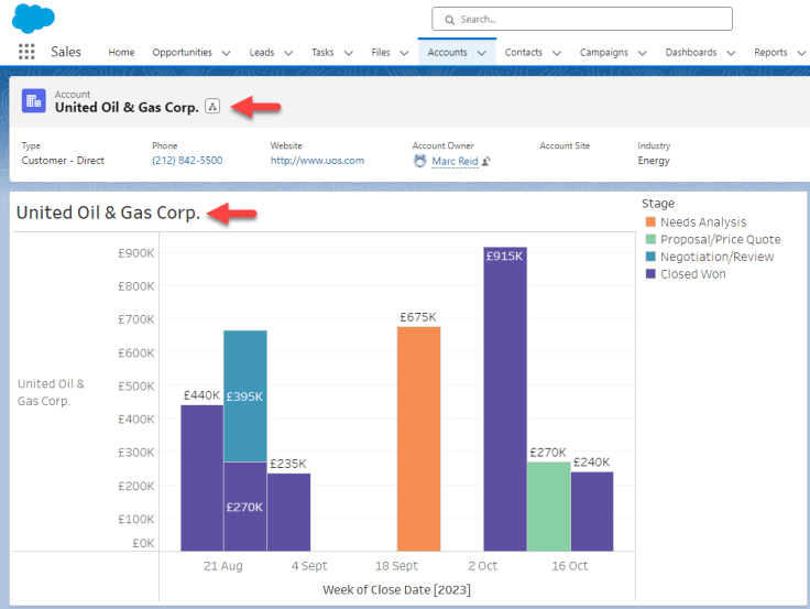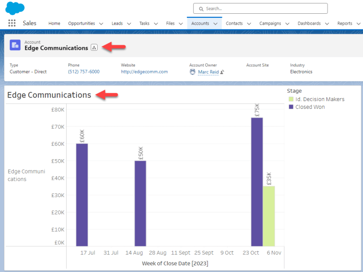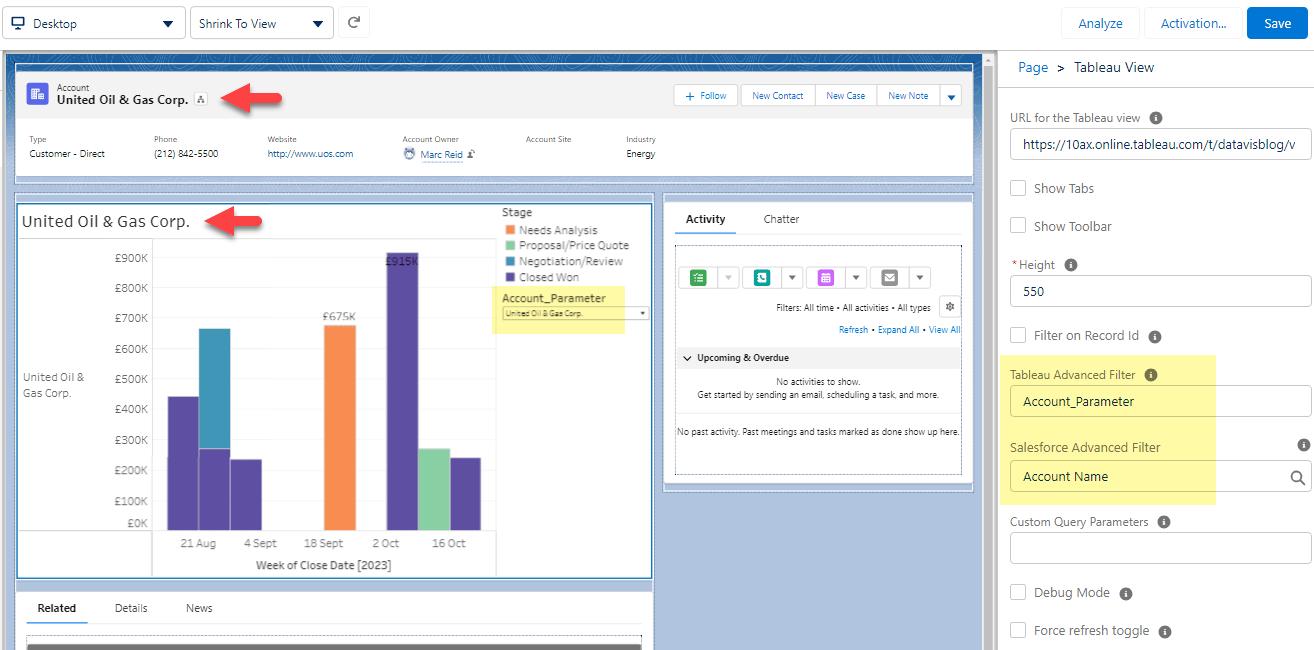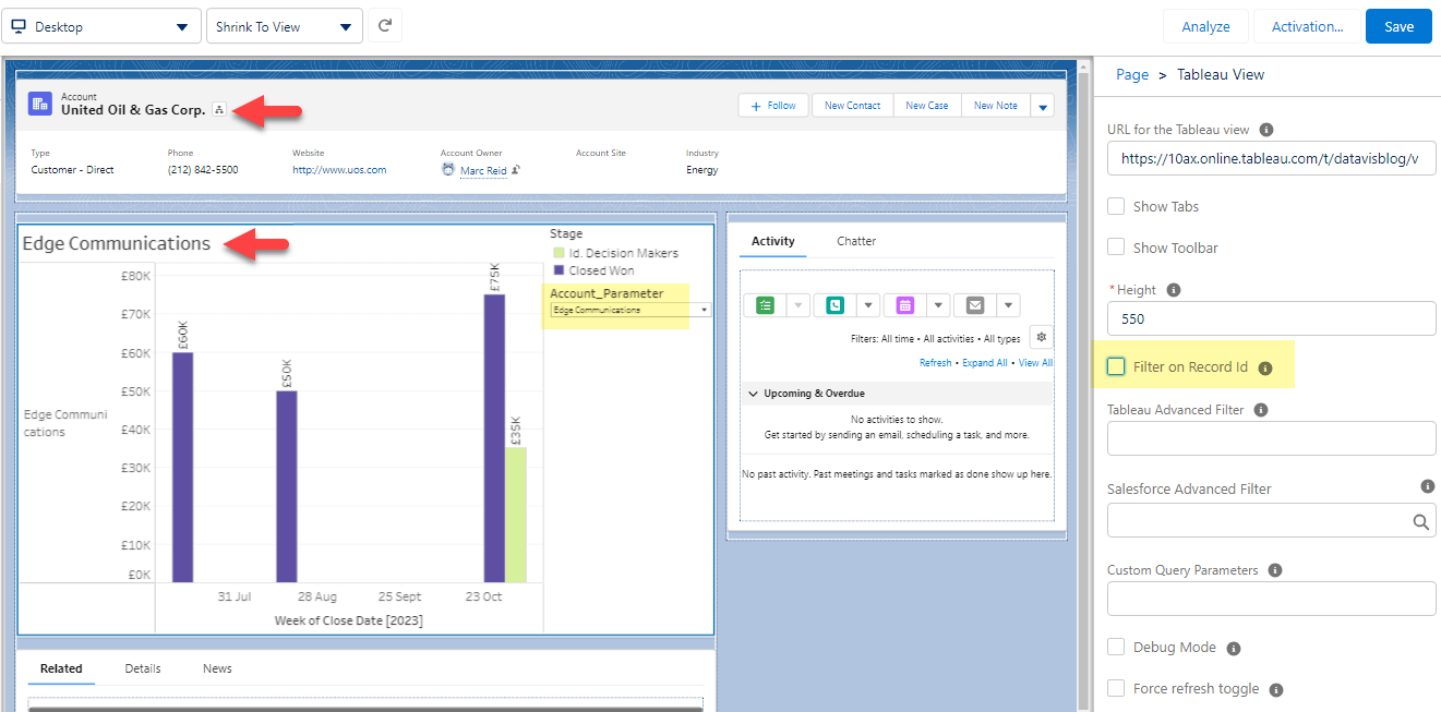 With the parameter added to the view, I’ll publish the updated view and uncheck the Filter on Record Id option. The selected Account in the Tableau view now doesn’t match the selected Account in Salesforce because the parameter is set to Edge Communications and United Oil & Gad Corp. is selected in Salesforce: