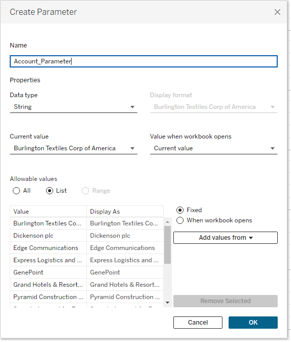 First, as a simple example, I’ll create a tableau parameter from the Account Name field and call this Account_Parameter: