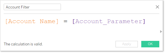 - Add the parameter name (Account_Parameter) into the Tableau Advanced Filter text box